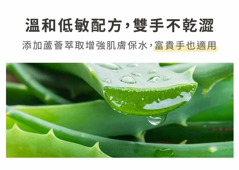 • 溫和親膚:低敏蘆薈保水配方,洗後雙手不乾澀、不刺激。