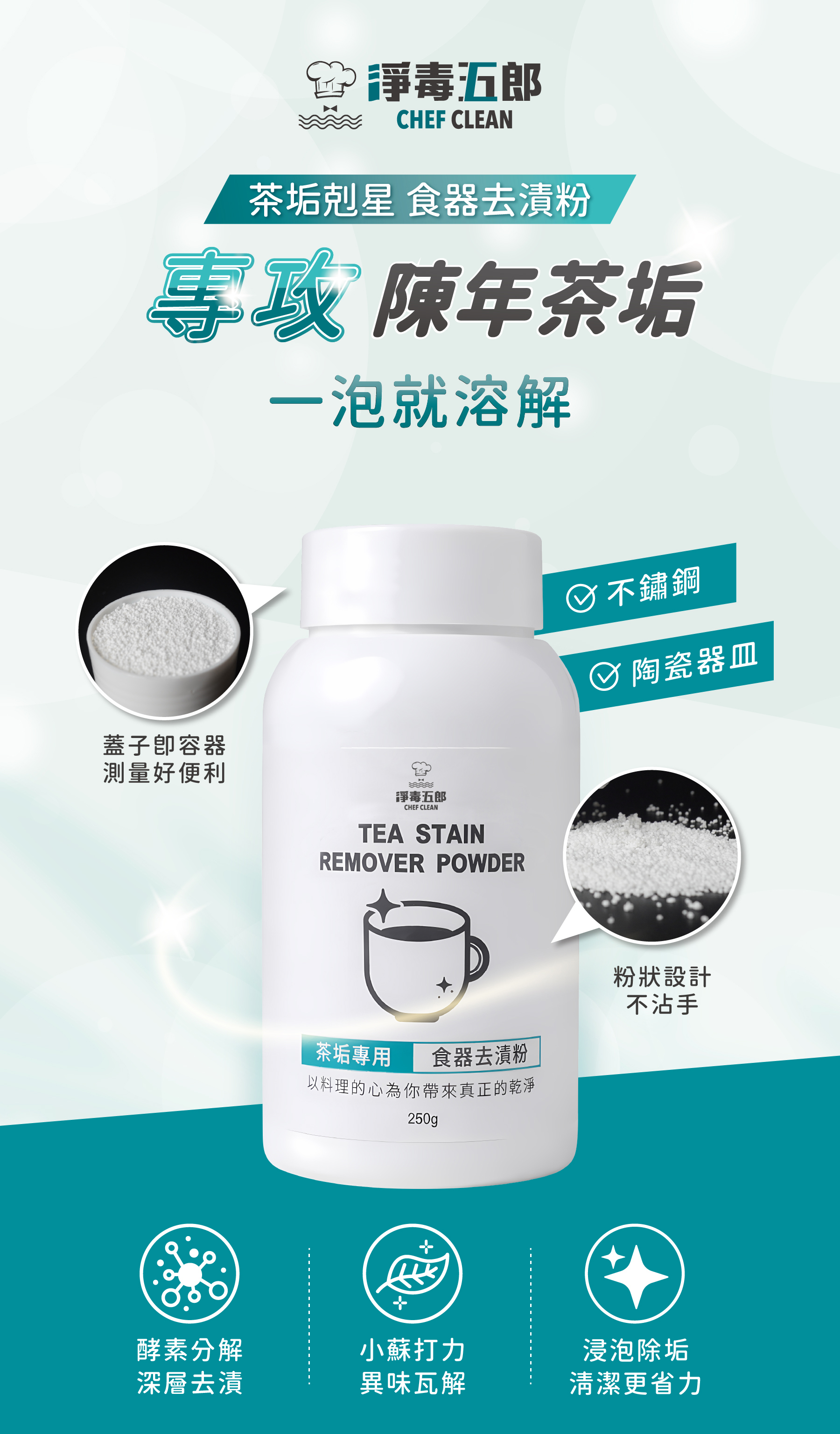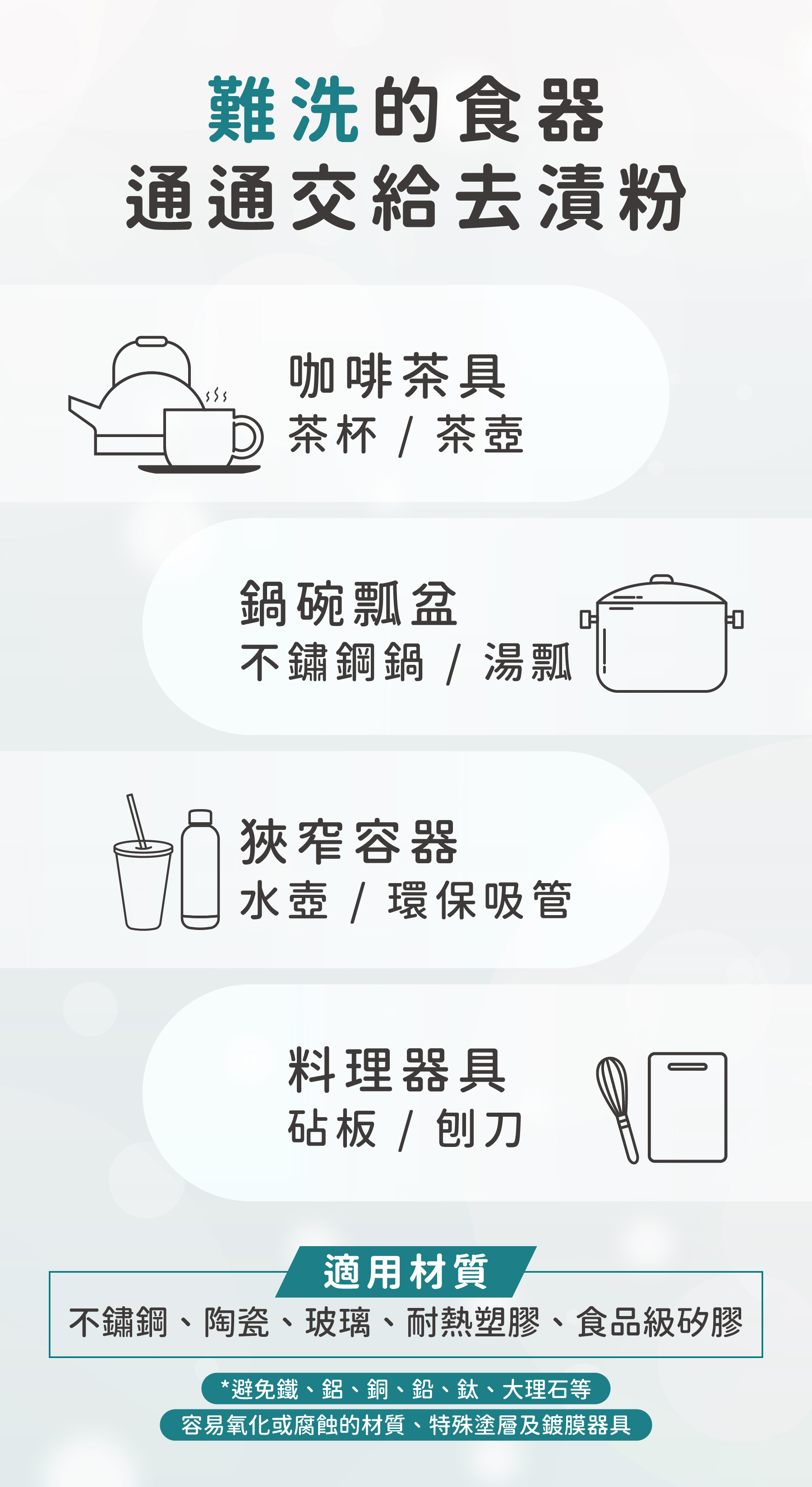 食器去漬粉:活氧深層去垢技術,輕鬆去除咖啡漬、茶垢,同步消除異味。