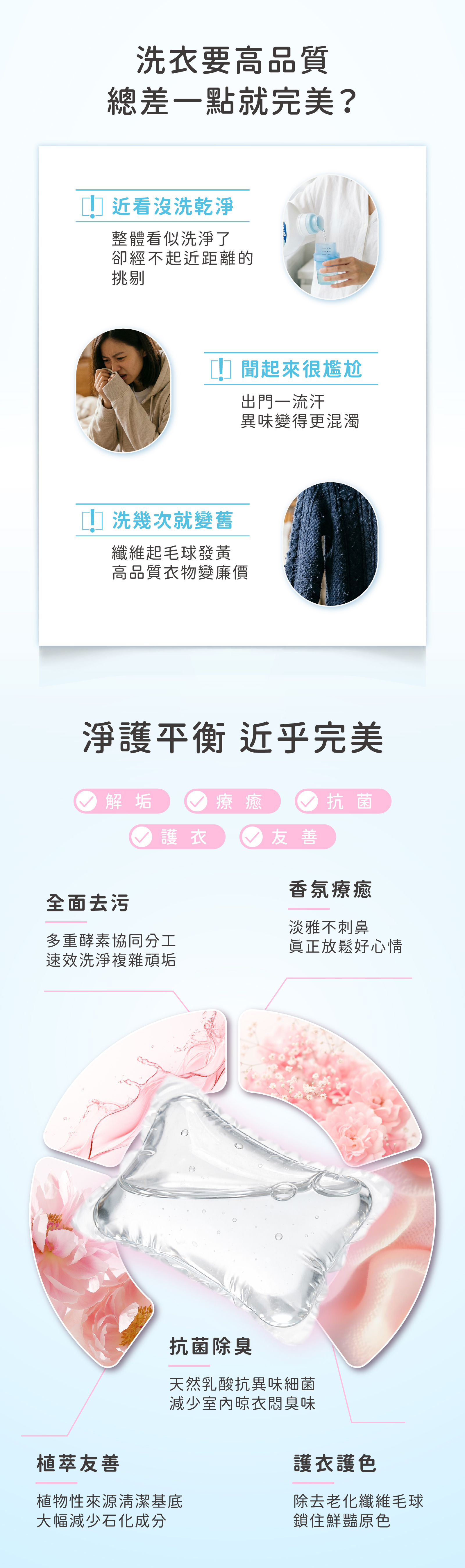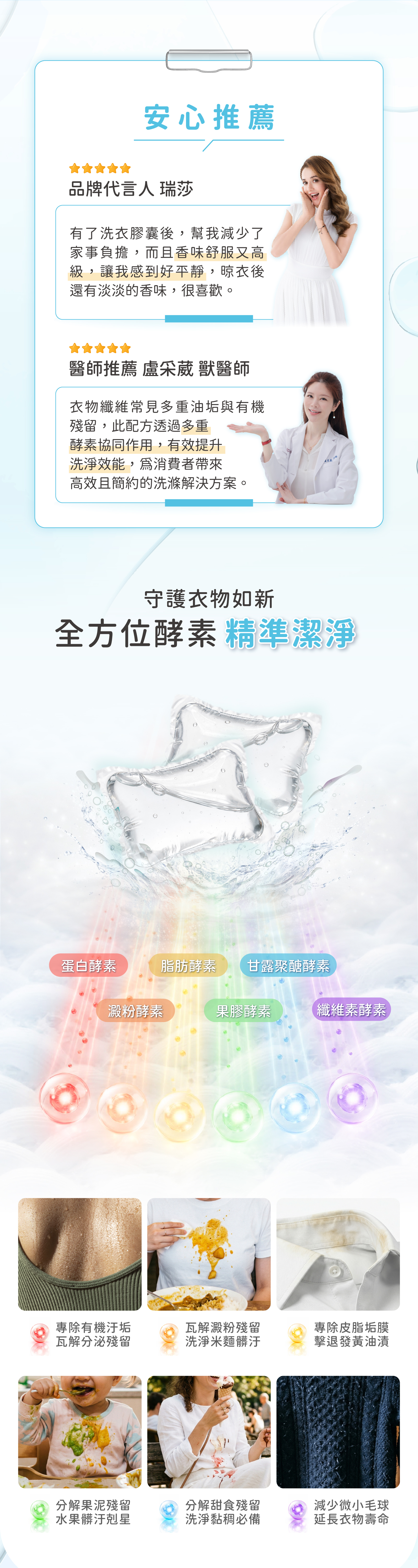● 酵素去汙:多重酵素深入纖維,有效分解皮脂髒污。