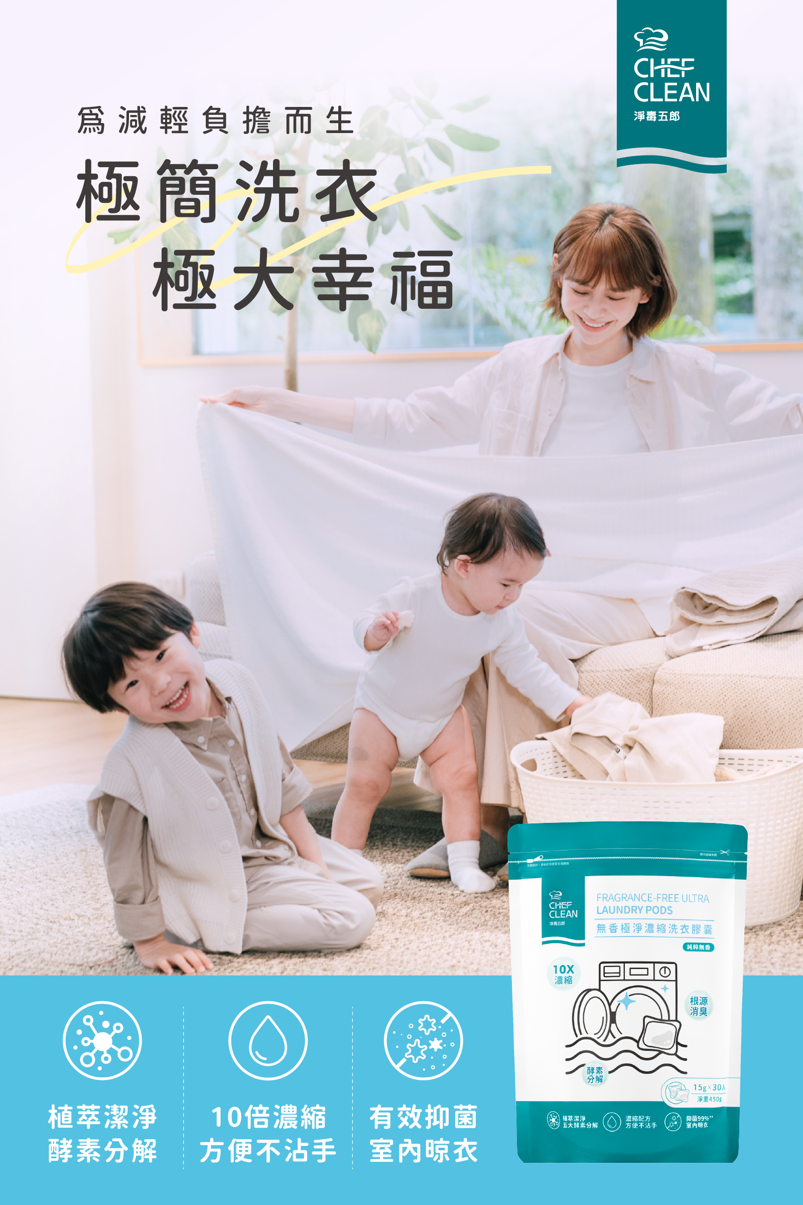 植萃潔淨 ‧ 酵素分解 ‧ 10倍濃縮 ‧ 方便不沾手 ‧ 有效抑菌 ‧ 室內晾衣