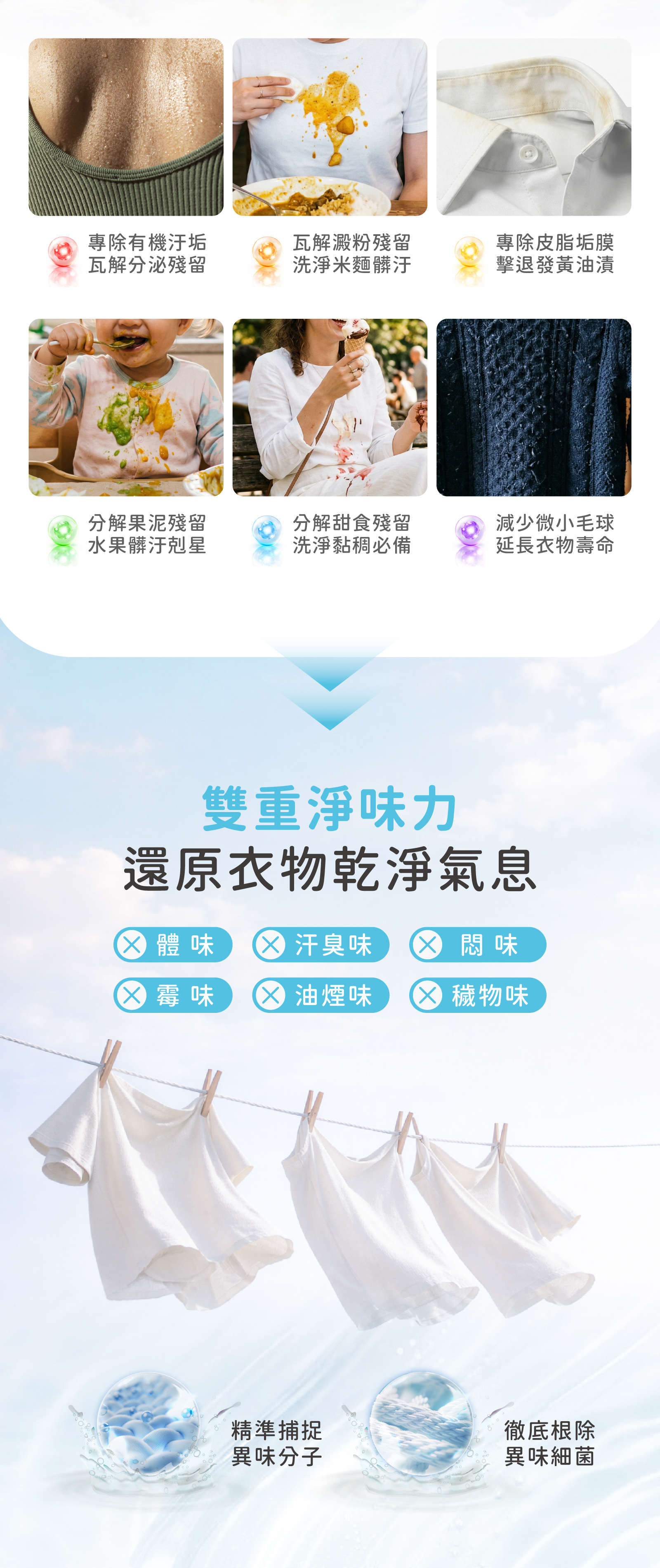 ● 酵素去汙:多重酵素深入纖維,有效分解汗漬、皮脂與日常髒污。