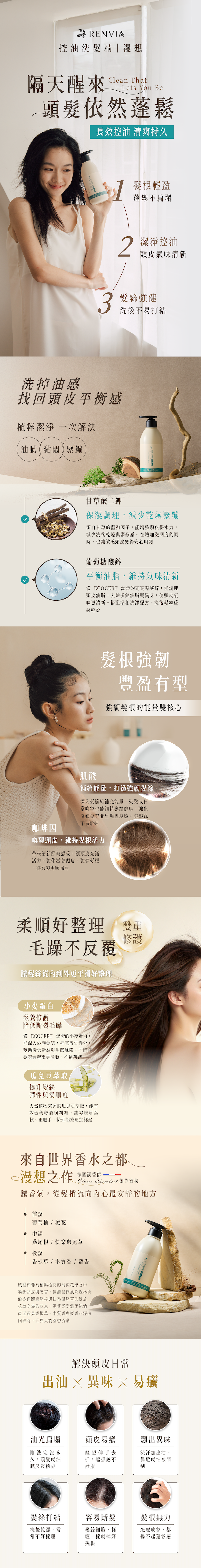 RENVIA 控油洗髮精以植物來源潔淨成分,帶走多餘油脂與髒污,幫助頭皮保持清爽平衡。搭配植萃修護配方,減少乾澀毛躁,讓頭皮與髮絲同時獲得舒適呵護,讓髮絲依然蓬鬆輕盈、不易打結,隔天也不扁塌。